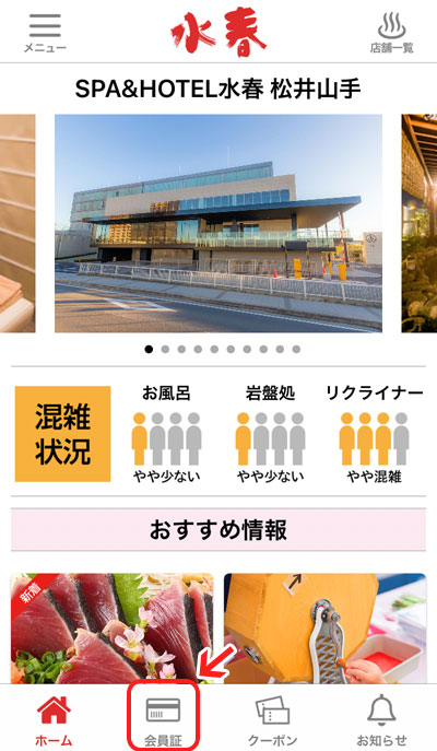アプリのダウンロードが完了したら、水春アプリ画面下部のメニューから会員証の項目を選択します。