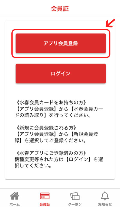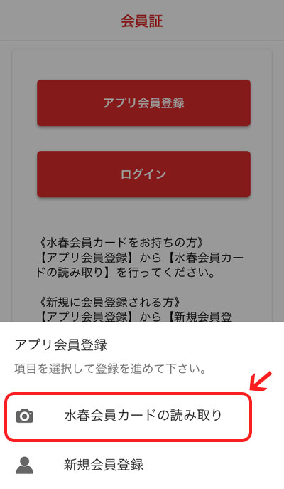 会員証の画面で「アプリ会員登録」をタップします。すると選択項目が出てきますので、「水春会員カードの読み取り」を選択します。