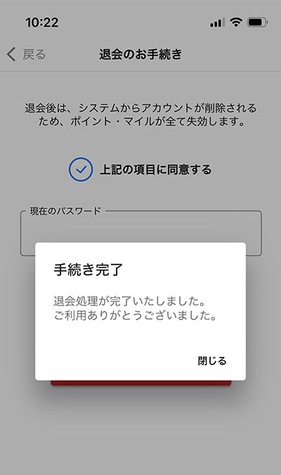 退会に関する注意事項をお読みいただき、ご承諾いただけましたら「上記の項目に同意する」をタップしてください。パスワードを入力し、「退会する」ボタンをタップで退会の手続きは完了です。
